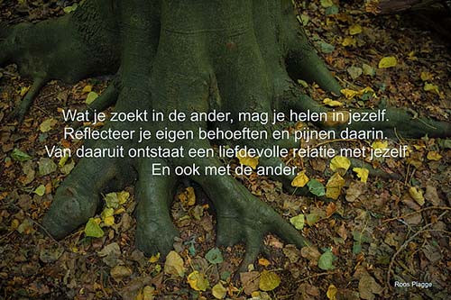En die persoon, of die relatie waarin je bent, kan deze stukken nooit voor jou opvangen. Daarom ontstaan er in relaties vaak zulke heftige stukken. Onbewust kan je willen dat je huidige partner of vriend(in) deze stukken voor je opvangt, heelt of koester. En dat gaat niet, dat heb je waarschijnlijk al gemerkt. Althans voor een deel kan je partner, vriend of vriendin hier wel heling in brengen, maar dan zal je beiden heel bewust moeten staan in de relatie en er echt over moeten kunnen praten met elkaar en in respect en openheid. Maar omdat het over pijnen gaat, kan dat een hele uitdaging zijn. En het zelf aan kunnen gaan van je eigen ‘eventuele’ wonden is altijd toch de eerste stap.